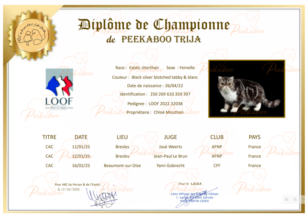 C’est une chatte douce, observatrice, très attachée à sa famille humaine, mais aussi dotée d’un excellent tempérament en exposition, où elle a brillamment décroché son titre de Championne en 2025 🌟
