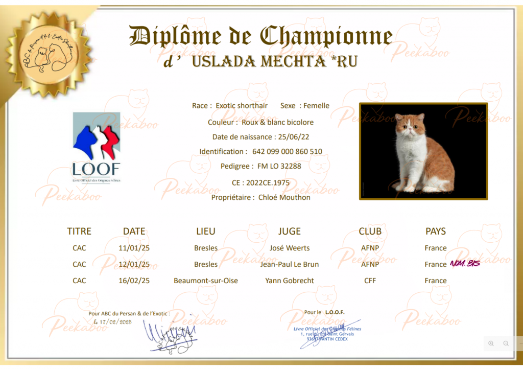 Elle s’est brillamment illustrée en expositions félines, remportant son titre de Championne en 2025 et nom BIS , grâce à sa beauté classique et son attitude toute en charme.